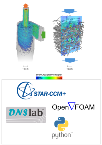 Wir analysieren, charakterisieren und optimieren Bauteile und Materialien für Sie durch Strömungs- und Partikelsimulation, inkl. Variationsrechnungen und statistische Auswertungen. Je nach Anwendung auf der Makroskala (z.B. abgebildet Zyklon-Partikelabscheider) oder Mikroskala (faseriges Filtermedium rechts daneben) können wir aus einer Bandbreite verschiedener spezialisierter Softwaretools zurückgreifen. Es steht sowohl kommerzielle Software von Drittanbietern zur Verfügung als auch kostenlose Open Source Software und Software die wir selber entwickeln (DNSlab, Python).