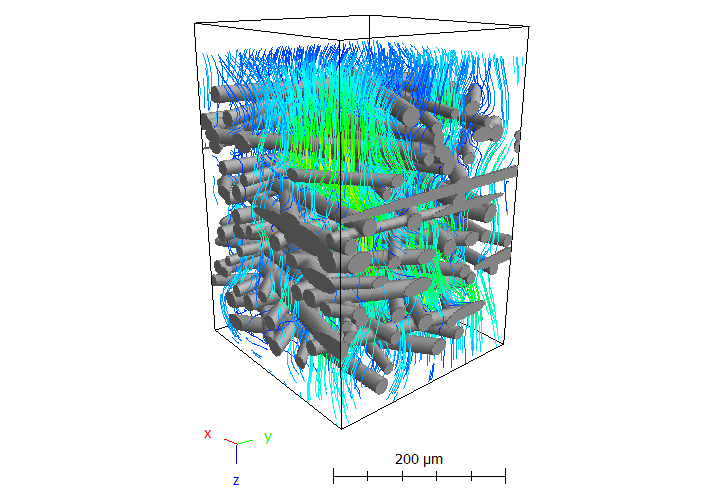 Wir analysieren, charakterisieren und optimieren Bauteile und Materialien für Sie durch Strömungs- und Partikelsimulation, inkl. Variationsrechnungen und statistische Auswertungen. Je nach Anwendung auf der Makroskala (z.B. abgebildet Zyklon-Partikelabscheider) oder Mikroskala (faseriges Filtermedium rechts daneben) können wir aus einer Bandbreite verschiedener spezialisierter Softwaretools zurückgreifen. Es steht sowohl kommerzielle Software von Drittanbietern zur Verfügung als auch kostenlose Open Source Software und Software die wir selber entwickeln (DNSlab, Python).