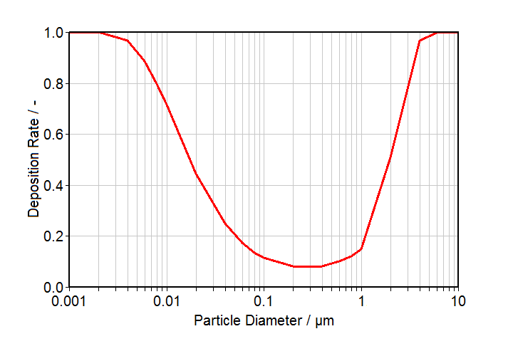 Unter der Voraussetzung einer hinreichend geringen Partikelkonzentration können die Rückwirkung der Partikel auf die Gas- oder Flüssigkeitsströmung sowie Partikel-Partikel Wechselwirkungen vernachlässigt werden. Die Filtereffizienz des porösen Mediums kann dann mit DNSlab berechnet werden, indem zunächst ein stationäres Strömungsfeld durch numerisches Lösen der Navier-Stokes-Gleichungen und anschließend die Partikeltrajektorien und eventuelle Kollision mit der porösen Struktur berechnet werden. Aus dem Verhältnis der abgeschiedenen Partikel zur Gesamtanzahl der Partikel einer Partikelgrößenklasse ergeben sich die Fraktionsabscheidegrade.